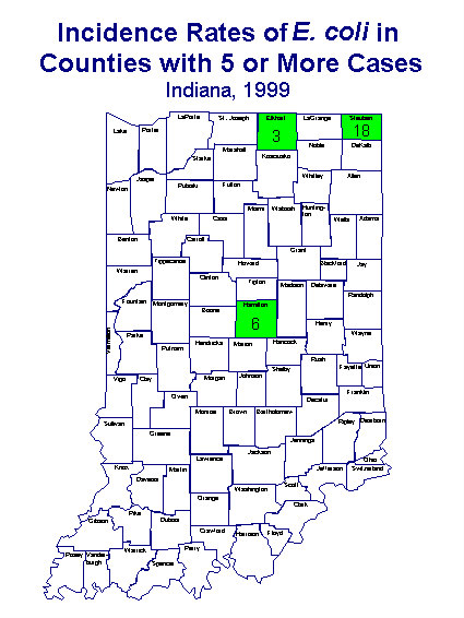 There were no outbreaks of E. coli O157:H7 infection reported in Indiana in 1999.