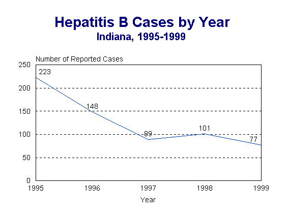 In 1999, a record low number of cases of acute hepatitis B were reported to the Indiana State Department of Health (ISDH). Figure 1 shows reported cases during the past five years.