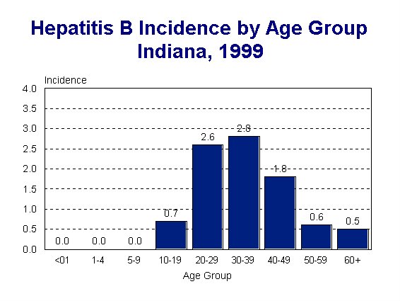 Rates of acute hepatitis B infection varied with age. The highest rate in Indiana is found in adults aged 30-39 years (2.8/100,000 population). Figure 2 shows the incidence of acute hepatitis B by age group.