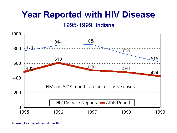 The number of HIV infection and AIDS diagnoses (HIV Disease) has decreased for the last several years. The number of new HIV infections may be declining due to changes in behaviors that put people at risk for contracting HIV Disease. The number of AIDS diagnoses has declined due to new medications and combinations of medications that mediate the severe impact on the immune system. Figure 1 includes HIV/AIDS reports of infected persons who have moved to Indiana with disease.