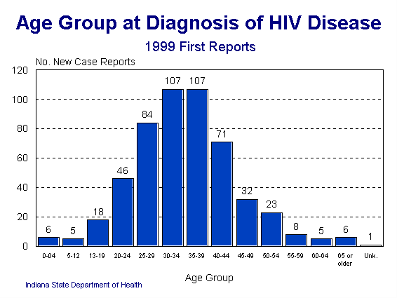 The number of AIDS cases reported in 1999 decreased from the number reported in 1998 in Indiana (Table 1). The number of AIDS cases reported in the United States in 1999 was less than the number reported in 1998 also. The decrease in reported AIDS cases does not necessarily indicate a decrease in HIV infection diagnoses in 1999, but does demonstrate the effect of medications that are preventing or delaying severe immunosuppression (AIDS). Of the AIDS cases reported in 1999, 239 (50%) were diagnosed in 1999. The remaining cases were diagnosed from 1984 to 1997 and reported first in 1998.