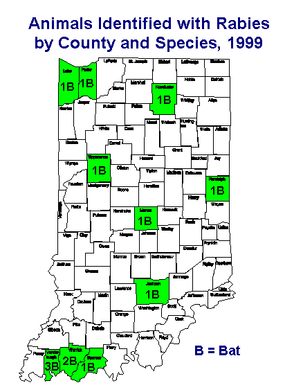 Bats submitted to the ISDH Rabies Laboratory are identified by species. In 1999, the identified species and the number of rabies positive bats were Eastern Pipistrella (2), Little Brown (2), Red (6), Hoary (2), and Big Brown (2). Virus variant identification was accomplished by the Centers for Disease Control and Prevention (CDC). Six rabies virus variants were identified from the 13 submitted samples. The virus variants were similar to the variants associated with the species from which they were isolated in other states. The variant isolated from the Eastern Pipistrella and Little Brown Bat is the variant associated with the majority of human rabies infections acquired in the United States. It is the same variant associated with the last human rabies death in the United States (Virginia in 1998). A history of an animal bite or exposure to bats was never determined for this individual.