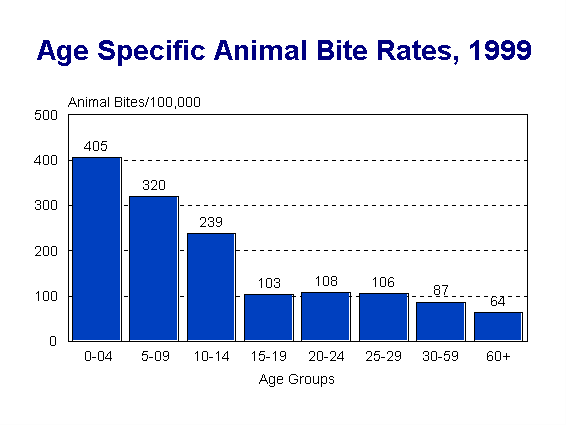 Children under age 15 are the most frequent victims of animal bites. Of the 8,082 animal bites where the victim's age was known, 4,014 (49.6%) were under age 15. Figure 2 illustrates the disproportionate high rates in the younger age groups. The female:male bite victim ratio varies by age group also. The female:male ratio is1:1.04 in the 0-4 age group, 1:1.31 in the 5-9 age group, 1:1.65 in the 10-14 age group, and 1:0.89 in the above 15 age group.