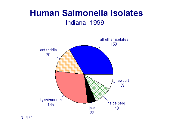 There are over 2300 different Salmonella serotypes that differ in somatic and flagellar antigens. The ISDH requests that clinical laboratories submit all positive Salmonella isolates to the ISDH Laboratories for free confirmation and serotyping. During 1999, serotypes were determined for 72% of the reported Salmonella cases. Figure 1 shows the distribution of Salmonella serotypes from initial and reference specimens submitted to the ISDH Enterics Laboratory. Of the 474 Salmonella isolates of known serotype, 135 (28%) were typhimurium (including 45 that were Copenhagen variant), 70 (15%) were enteritidis, 49 (10%) were heidelberg, 39 (8%) were newport, 22 (5%) were java, and the remaining 159 (34%) were other serotypes.