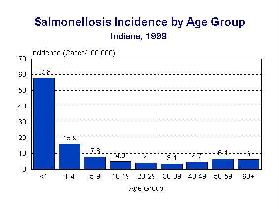 There was little difference in the rates of salmonellosis by race or sex. Overall age-specific rates were greatest among infants (57.8) followed by preschoolers (15.9) (Figure 4).