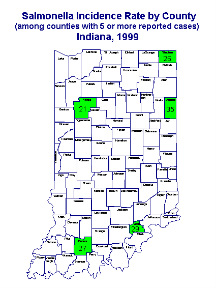 Among counties with at least 5 reported cases, incidence rates of salmonellosis were greatest in Adams (35.4), Scott (28.6), Dubois (27.3), Steuben (25.5) and White (21.5) counties (Figure 5).