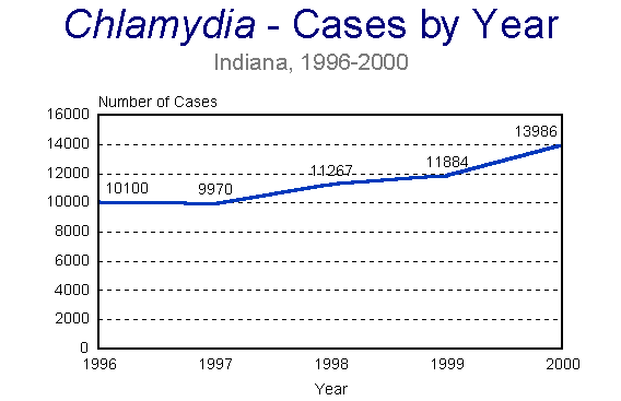 While Chlamydia trachomatis has been known to cause sexually transmitted genital infection for a number of years, economical and practical diagnostic methods were not available to physicians until recently. Recent innovations in Chlamydia testing have made test results much more accurate than had been true previously. Figure Chl1 shows the change in the number of reported cases from 1996 to 2000. Changes in testing methods may account for the increase in the number of reported cases in 2000 and will play an even greater role in year 2001 data, when even more accurate tests become available. Increases also occur as screening sites funded through the Indiana State Department of Health (ISDH) are added to the program, giving more women the opportunity to be tested for Chlamydia.