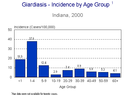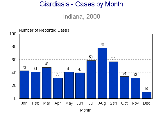 Among counties with at least 5 cases reported, the incidence rates were highest in Bartholomew (39.2), DeKalb (32.3), Decatur (24.4), Whitley (22.8) and Randolph (18.3) Counties. No outbreaks of giardiasis were reported in Indiana in 2000.