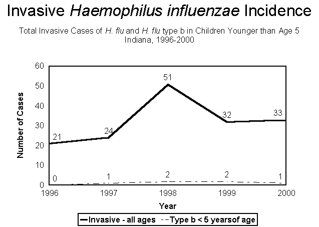 In 2000, of the 33 cases of invasive Haemophilus influenzae reported, 31 (93.9%) were serotyped. Efforts must continue to ensure that all invasive isolates are serotyped to determine if type b illness is present.
