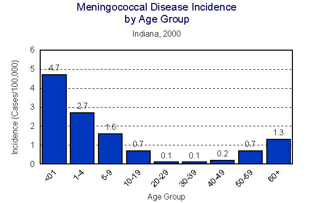 Meningococcal disease tends to strike infants, children, and young adults. Although the case rate for infants was higher than any other age group, the rate (4.7/100,000 population) was much lower than the 5-year median (17). (Figure Men3). There were two cases in students attending college.