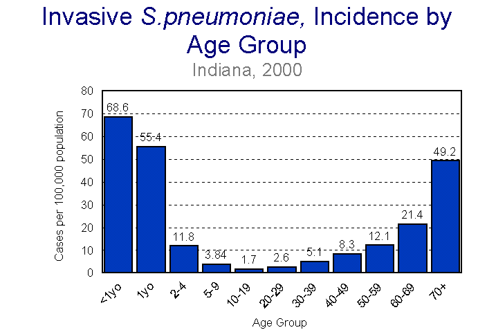 Surveillance of invasive Streptococcus pneumoniae (pneumococcal disease) has been ongoing in Indiana since June 1998. Among all Indiana residents, 710 cases were reported (11.68/100,000 population) in 2000, compared with 691 cases (11.63) in 1999. Incidence of invasive pneumococcal disease varies considerably with age, with the highest rates occurring in children ages 2 or less and ages 65 and older (Figure Strep1).