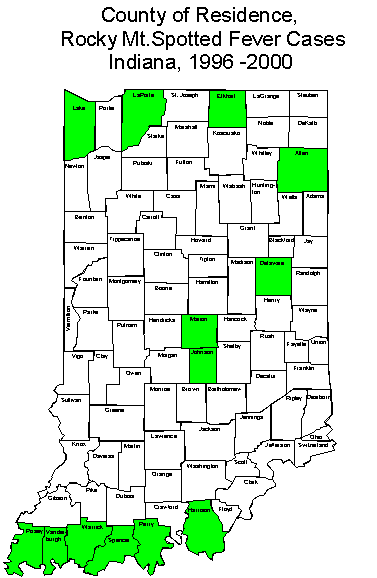 Figure RM2: County of Residence, RMSF Cases, Indiana, 1996-2000 |