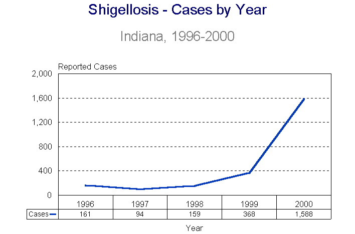 In 2000, 1,588 cases of shigellosis were reported in Indiana, over four times the number of cases reported in 1999 (Figure Shg1). This is the third consecutive year that the incidence of shigellosis infection has increased. Shigellosis incidence generally varies within a 5 to 6 year cycle. The 2000 incidence was particularly high due to several reported outbreaks, including an exceptionally large outbreak in Marion County.