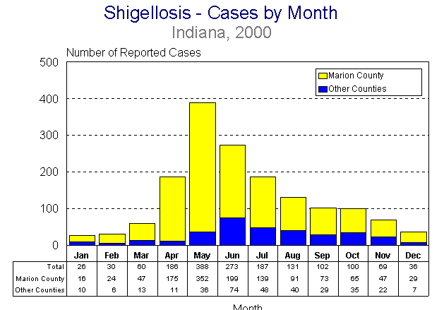 Four outbreaks of shigellosis occurred in 2000. The causative agent for all of these was confirmed as Shigella sonnei. As stated earlier, the most significant outbreak occurred in Marion County. Beginning in January and peaking in May, over 1,200 cases were identified throughout the year, particularly in children attending day-care centers and elementary schools and their contacts. The outbreak had greatly diminished by the end of 2000 but had not completely resolved. During June and July, an outbreak occurred at an Allen County day-care center. Cases included at least 32 children and 5 staff members. In July and August, an Elkhart County daycare center experienced an outbreak, with at least 10 children becoming ill. At least 9 students and staff at a Morgan County elementary school developed shigellosis during September and October. Shigella can be transmitted both through foodborne and person-to-person routes, however, all of these outbreaks were attributed to person-to-person transmission.