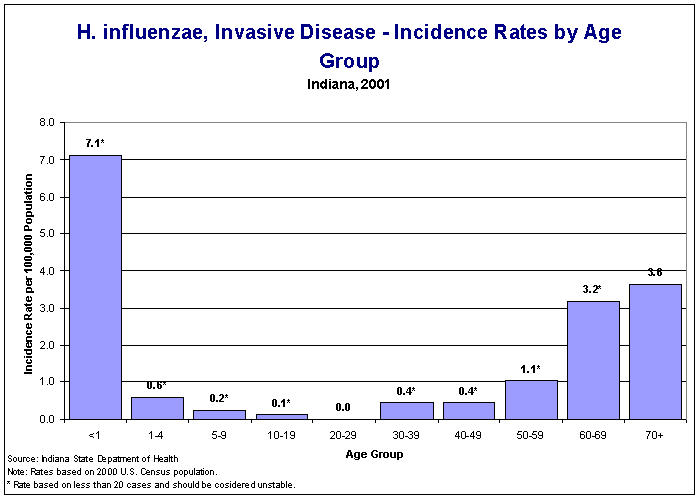 Figure Hi2: H. influenzae, Invasive Disease - Incidence Rates by Age Group, Indiana, 2001 |