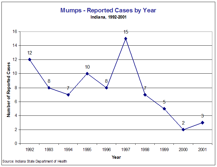Three cases of mumps were reported as confirmed or probable to the Indiana State Department of Health (ISDH) during 2001, compared with two cases in 2000 (see Figure Mumps1 for 10-year trend). The three cases occurred in persons ages 3, 7, and 63. Two of the cases were males and one was female, and all cases were of the white race. One of the cases (age 7) was serologically confirmed, while laboratory analysis was not preformed on the other two cases. The two cases which were not serologically confirmed did meet the clinical case definition for mumps, which is defined as "an illness with acute onset of unilateral or bilateral tender, self-limited swelling of the parotid or other salivary gland, lasting equal to or greater than 2 days and without other apparent cause.