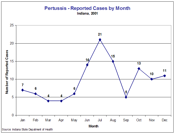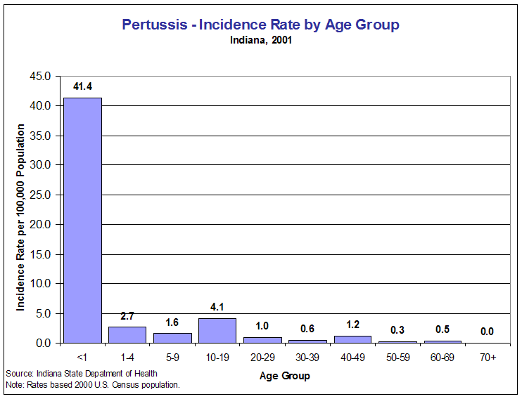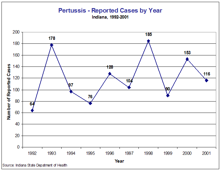 In 2001, Indiana had 116 reported cases of pertussis, a decrease from 153 cases in 2000. Thirty-four counties had at least one case of pertussis during the year, down from 41 counties in 2000 (Table Per1).