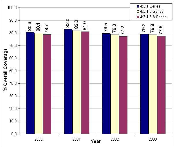 Figure 1: Overall coverage levels of 2-year olds seen by all public providers; 2000 (n=135), and 2001 (n=162), 2002 (n=165), and 2003 (n=171).