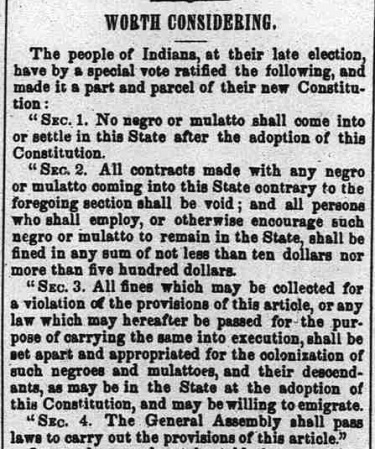 Article 13 of the 1851 Indiana Constitution was adopted separately from the rest of the new Constitution; only 4 of the 91 counties voted against adoption. This is an excerpt from a longer article; the paper was begun in January 1847 by the American and Foreign Anti-Slavery Society. Source: Washington D.C. The National Era, September 4, 1851.