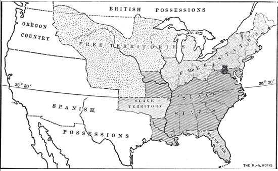 Slave and Free Areas after the Missouri Compromise, 1815-1825. The Missouri Compromise, 1820, admitted Missouri as a slave state and Maine as a non-slave state to maintain the balance between slave and free states in the nation. It also outlawed slavery above latitude 36°30’. Source: Jacques W. Redway, F.R.G.S., The Redway School History (New York, NY: Silver, Burdett and Company, 1910). Downloaded from Maps ETC, on the web at http://etc.usf.edu/maps. [map #07719]. Courtesy the Private Collection of Roy Winkelman.