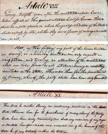 The 1816 Indiana Constitution forbade slavery in Article 8, sec. 1 and Article 11, sec. 7. Source: The full text of the 1816 Indiana Constitution is available at “Road to Indiana Statehood,” The Digital Collections of IUPUI University Library at http://www.ulib.iupui.edu/digitalscholarship/collections/ISC .