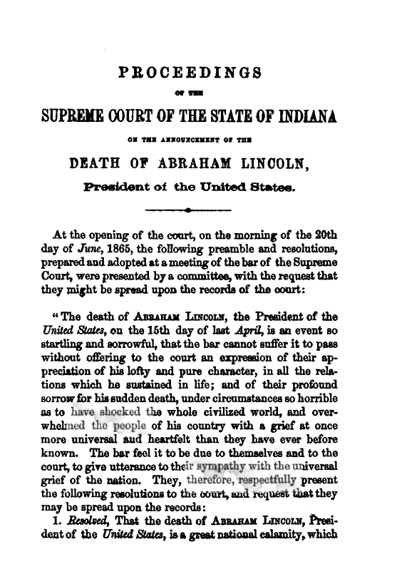 Proceedings of the Supreme Court of the State of Indiana on the Announcement of the Death of Abraham Lincoln, President of the United States,” June 20, 1865.