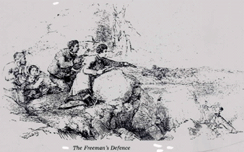 The following day the abolitionists held their meeting in the woods. As they opened their meeting, a shout came from the woods and a mob of about thirty men, armed with stones and eggs, converged on the group. William White remembered the leader as "a fellow in a coon skin cap, tail and all, [who came] as a representative of the great Whig party, and another barefooted man, with nothing but a dirty shirt and pantaloons on, and the former half off his shoulders, as representation of the democracy of the country."