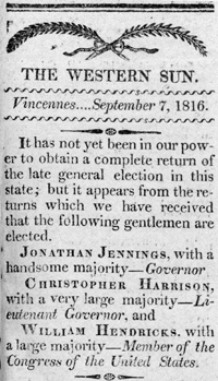 The Vincennes Western Sun issue of September 7, 1816 provided this interesting announcement of the results of the August 5 election. The August 31 issue indicates that the paper has no returns yet from Dearborn, Franklin, Gibson, Perry, Posey, and Warrick counties.