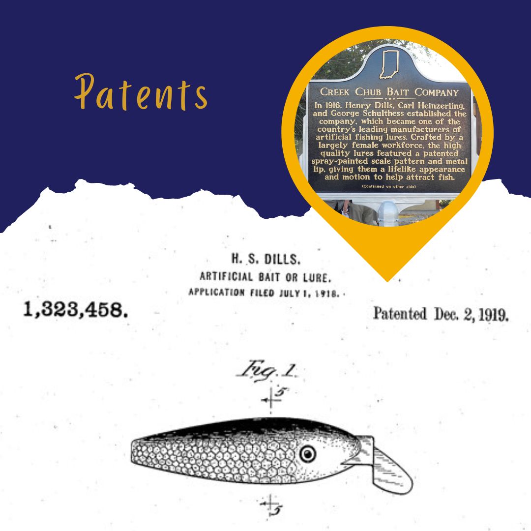 While researching the Creek Chub Bait Company in DeKalb County in 2017, we used patents to better understand the high-quality artificial fishing lures the company manufactured. The patents provided explanations and diagrams of the spray-painted scale pattern and metal lip of the lures, which helped attract more fish and, in turn, caused the company’s sales to boom. Through patents, we were able to learn about the new lures and processes the company created throughout the twentieth century. You can search for patents by the inventor, invention, and date through Google Patents.