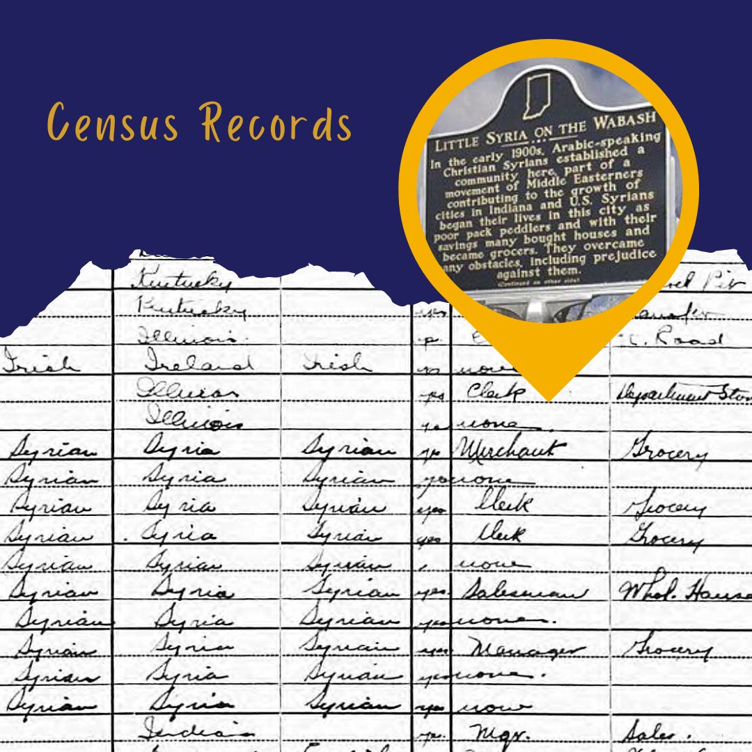 We use Census records while researching a variety of marker topics, but they can be particularly helpful in learning about ethnic groups that lived in a city during a certain period. For example, through these records, we were able to learn about the Syrian immigrants who settled in Terre Haute in the early 1900s and established a thriving community in the city. The 1910 and 1920 U.S. Censuses for that area include several Syrian families and highlight how many began as peddlers and eventually became grocers and retail merchants. Census records can tell us where these individuals were born, where their parents were born, and what year they immigrated to the United States.
