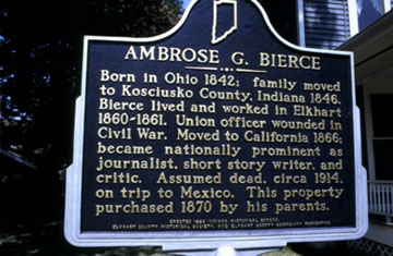 Born in Ohio 1842; family moved to Kosciusko County, Indiana 1846. Bierce lived and worked in Elkhart 1860-1861. Union officer wounded in Civil War. Moved to California 1866; became nationally prominent as journalist, short story writer, and critic. Assumed dead, circa 1914, on a trip to Mexico. This property purchased 1870 by his parents.
