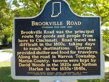 Brookville Road was the principal route for goods and people from here to Cincinnati. Road travel was difficult in the 1800s, taking days to reach destinations. Taverns provided shelter and food for travelers. Along the road in Warren Township, Marion County, taverns were kept by David Woods in the 1820s and Nathan Harlan in the 1830s - 1840s.