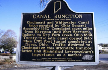 Cincinnati and Whitewater Canal incorporated by Ohio General Assembly 1837. Completed seven miles from Harrison (now West Harrison), Indiana to Dry Fork Creek, Ohio 1840. Twenty-five mile canal opened 1843 when 1, 782 foot tunnel completed at Cleves, Ohio. Traffic diverted to Cincinnati on this interstate transportation link diminished Lawrenceburg's importance as a market.