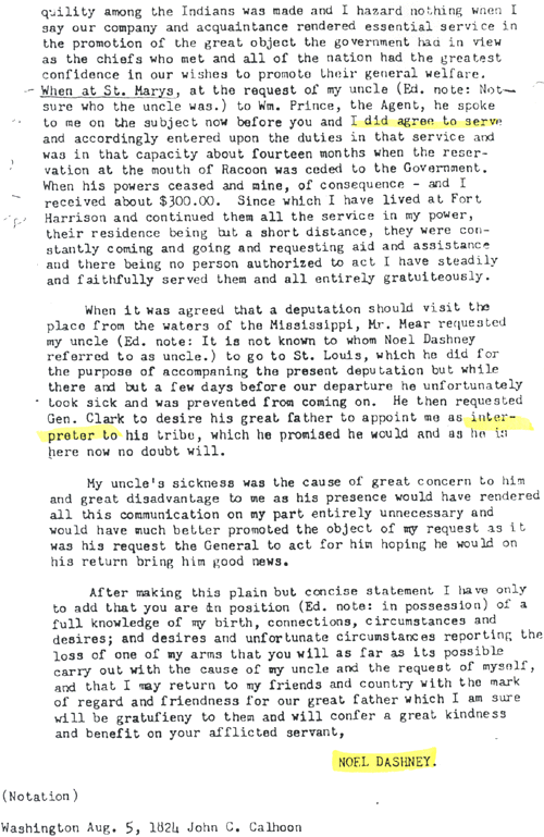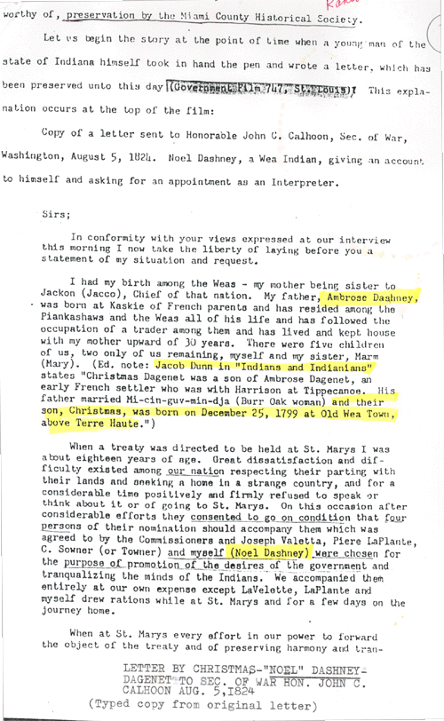 Noel Dashney to John C. Calhoun, Secretary of War, received August 5, 1824, typescript in Walter Crotchett, "Last Chief of the Weas, The Story of the Confederated Tribes in Miami County [Kansas]," edited by Philip S. Thomas (1981)