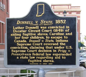 Luther Donnell was convicted in Decatur Circuit Court (1849) of aiding fugitive slaves, Caroline and her four children, (2) to escape to Canada. (3) In Donnell v. State, Indiana Supreme Court reversed the conviction, claiming that under U.S. Supreme Court decision in Prigg v. Pennsylvania federal law superseded a state law regarding aid to fugitive slaves. (4)
