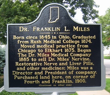Born circa 1845 in Ohio. (1) Graduated from Rush Medical College 1874. (2) Moved medical practice from Chicago to Elkhart 1875. (3) Began The Dr. Miles Medical Company 1885 to sell Dr. Miles' Nervine, Restorative Nerve and Liver pills, and other medicines; Miles was a Director and President of company. (4) Purchased land here, on corner of Fourth and Franklin, 1900. (5)