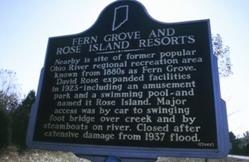 Nearby is site of former popular Ohio River regional recreation area known from 1880s as Fern Grove. David Rose expanded facilities in 1923-including an amusement park and a swimming pool-and named it Rose Island. Major access was by car to swinging foot bridge over creek and by steamboats on river. Closed after extensive damage from 1937 flood.