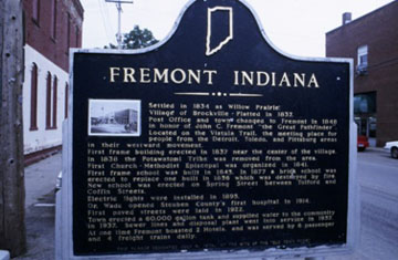 Settled in 1834 as Willow Prairie; Village of Brockville - Platted in 1837. Post Office and town changed to Fremont in 1848 in honor of John C. Fremont "the Great Pathfinder". Located on the Vistula Trail, the meeting place for people from the Detroit, Toledo, and Pittsburg areas in their westward movement. First frame building erected in 1837 near the center of the village. In 1838 the Potawatomi Tribe was removed from the area. First Church - Methodist Episcopal was organized in 1841. First frame school was built in 1845. In 1877 a brick school was erected to replace one built in 1856 which was destroyed by fire. New school was erected on Spring Street between Tolford and Coffin Streets. Electric lights were installed in 1895. Dr. Wade opened Steuben County's first hospital in 1914. First paved streets were laid in 1922. Town erected a 60, 000 gallon tank and supplied water to the community in 1937. Sewer lines and disposal plant went into service in 1957. At one time Fremont boasted 2 Hotels, and was served by 6 passenger and 4 freight trains daily. [illustration]