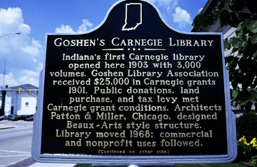 Indiana's first Carnegie library opened here 1903 with 3, 000 volumes.(1) Goshen Library Association received $25, 000 in Carnegie grants 1901.(2) Public donations, land purchase, and tax levy met Carnegie grant conditions.(3) Architects Patton & Miller, Chicago, designed Beaux-Arts style structure.(4) Library moved 1968; commercial and nonprofit uses followed.(5)