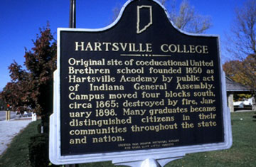 Original site of coeducational United Brethren school founded 1850 as Hartsville Academy by public act of Indiana General Assembly. Campus moved four blocks south, circa 1865; destroyed by fire, January 1898. Many graduates became distinguished citizens in their communities throughout the state and nation.