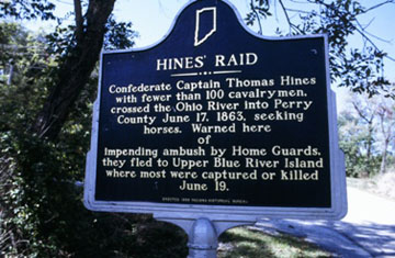 Confederate Captain Thomas Hines with fewer than 100 cavalrymen, crossed the Ohio River into Perry County June 17, 1863, seeking horses. Warned here of impending ambush by Home Guards, they fled to upper Blue River Island where most were captured or killed June 19.