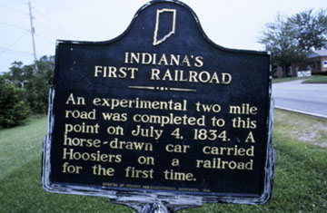 An experimental two mile road was completed to this point on July 4, 1834. A horse-drawn car carried Hoosiers on a railroad for the first time.
