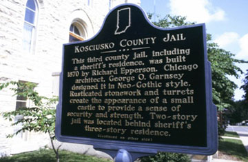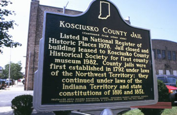 Listed in National Register of Historic Places 1978. Jail closed and building leased to Kosciusko County Historical Society for first county museum 1982. County jails were first established in 1792 under laws of the Northwest Territory; they continued under laws of the Indiana Territory and state constitutions of 1816 and 1851.