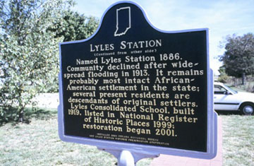 Named Lyles Station 1886. Community declined after widespread flooding in 1913. It remains probably most intact African-American settlement in the state; several present residents are descendants of original settlers. Lyles Consolidated School, built 1919, listed in National Register of Historic Places 1999; restoration began 2001.
