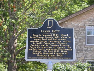 (4)At the first recorded meeting of the Neil's Creek Anti-Slavery Society, Hoyt was chosen as a director. Minute Book, January 5, 1839, Neil's Creek Anti-Slavery Society, Indiana Division, Indiana State Library. Transcription is available from Historic Eleutherian, Inc. He remained active throughout the life of the organization. Minute Book, January 5, 1839-May 31, 1845.