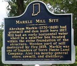 Abraham Markle (1770-1826) had gristmill and dam built here 1817. Mill had an early horizontal water wheel in a splatter box located within the stone foundation of the structure. Wooden part of mill destroyed by fire 1938. Markle was one of founders of Terre Haute Land Company. Also ran nearby general store, sawmill, and distillery.