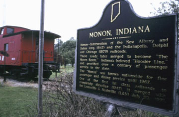 Monon-Intersection of the New Albany and Salem (org. 1847) and the Indianapolis, Delphi and Chicago (1878) railroads. These roads later merged to become "The Monon Route, " Indiana's beloved "Hoosier Line, " and provided over a century of passenger service to the state. The "Monon" was known nationwide for fine passenger and dining service until 1967. One of the first 1st class railroads to completely dieselize (1947), it merged with the Louisville & Nashville (L&N) July 30, 1971.