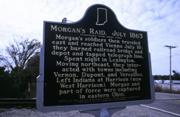 During the Civil War, Confederate General John Hunt Morgan (1825-1864) led a raid through southern Indiana July 8-13, 1863. Crossed Ohio River at Brandenburg, Kentucky on two commandeered steamboats with over 2, 000 cavalrymen and entered Indiana near Mauckport. Following a battle at Corydon, they traveled north to Salem.
