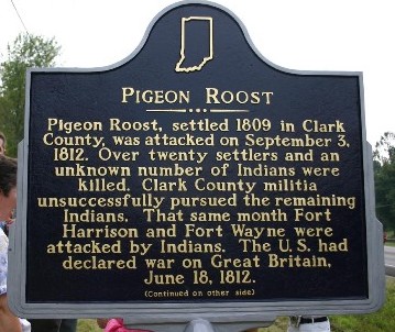 Pigeon Roost, settled 1809 in Clark County, was attacked on September 3, 1812. Over twenty settlers and an unknown number of Indians were killed. Clark County militia unsuccessfully pursued the remaining Indians. That same month Fort Harrison and Fort Wayne were attacked by Indians. The U.S. had declared war on Great Britain, June 18, 1812.