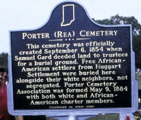 This cemetery was officially created September 6, 1854 when Samuel Gard deeded land to trustees for a burial ground. Free African-American settlers from Huggart Settlement were buried here alongside their white neighbors, not segregated. Porter Cemetery Association was formed May 9, 1884 with both white and African-American charter members.
